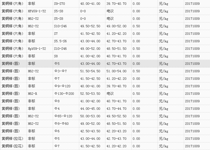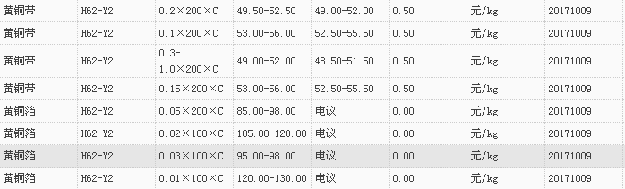 山东有色金属网2017-10-09黄铜类现货报价