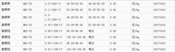 山东有色金属网2017-10-10黄铜类现货报价