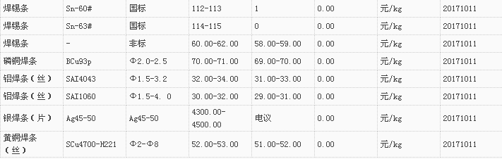 山东有色金属网2017-10-11炉料焊材类现货报价