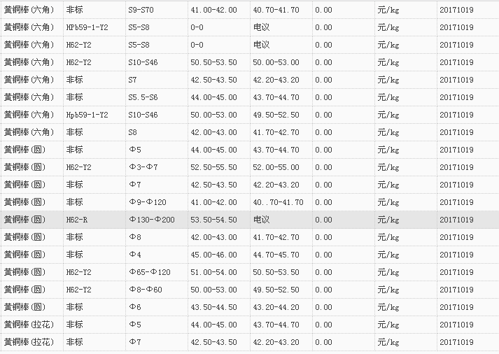 山东有色金属网2017-10-19黄铜类现货报价