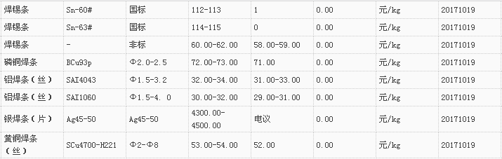 山东有色金属网2017-10-19炉料焊材类现货报价