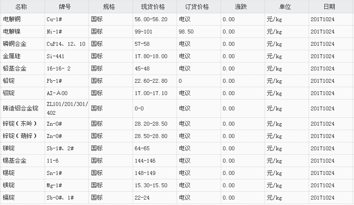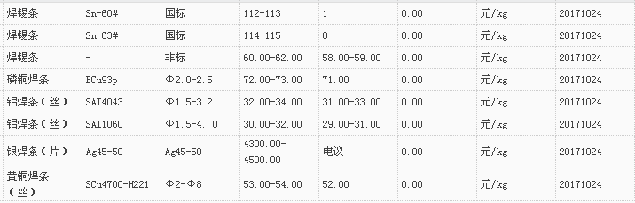 山东有色金属网2017-10-24炉料焊材类现货报价