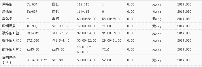 山东有色金属网2017-10-30炉料焊材类现货报价